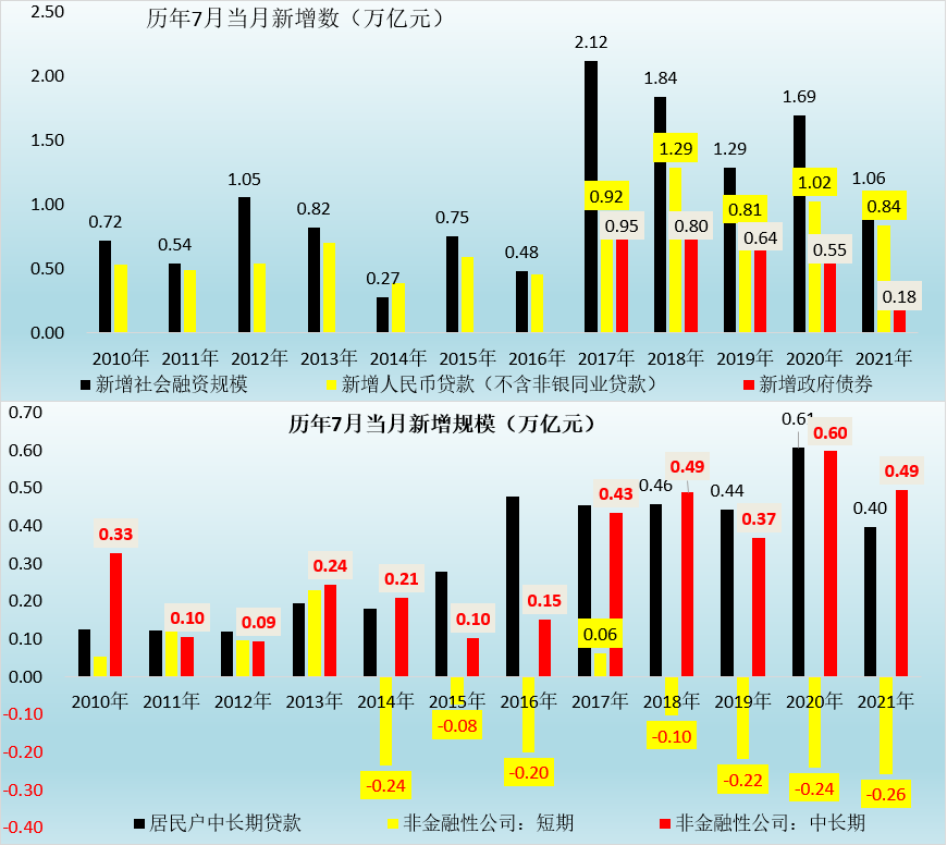 那么央行短期內(nèi)會(huì)不會(huì)放松政策來(lái)支撐社融呢?我們認(rèn)為央行可能還會(huì)觀察一段時(shí)期,再等等看。因?yàn)閺难胄械囊暯莵?lái)看,今年1-7月新增社融和新增人民幣貸款分別達(dá)到18.80萬(wàn)億和13.78萬(wàn)億,雖然較2020年同期分別少增-3.73萬(wàn)億和多增0.43萬(wàn)億,但較2019年同期仍分別多增2.90萬(wàn)億和2.95萬(wàn)億,因此絕對(duì)值上看似乎并不低?,F(xiàn)在市場(chǎng)可能更關(guān)心的是,監(jiān)管政策層面會(huì)不會(huì)有所放松?如地產(chǎn)和城投政策層面,目前來(lái)看這種可能性應(yīng)該是存在的,雖然不會(huì)允許新增,但基于存量債務(wù)化解的信貸支持應(yīng)該是有商量空間的,畢竟若實(shí)體經(jīng)濟(jì)出現(xiàn)流動(dòng)性危機(jī),屆時(shí)再出手拯救的難度會(huì)大幅提升。