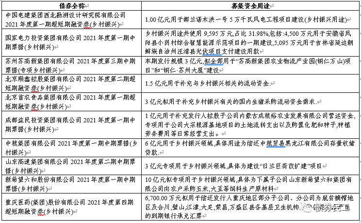 自2021年3月16日,重慶醫藥(集團)股份有限公司2021年度第四期超短期融資券(鄉村振興)作為第一只鄉村振興票據面世以來,鄉村振興票據受到的關注越來越多。2021年3月19日,銀行間市場交易商協會通過官方微信公眾號發布了《債務融資工具注冊發行業務問答(第8期)》(以下簡稱“《問答》”),對鄉村振興票據的實施細則進行了明確,確認募集資金投向分別對應的是農民就業增收項目、農業現代化建設項目和農村鄉村建設三大領域。