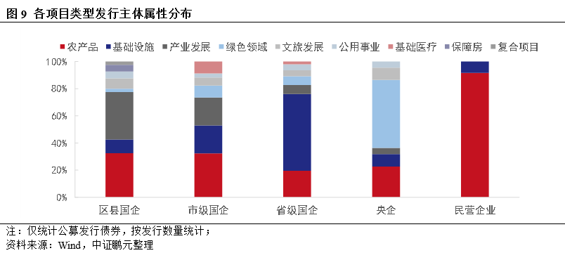 結(jié)合企業(yè)屬性來(lái)看:第一,區(qū)縣國(guó)企。主要承擔(dān)產(chǎn)業(yè)園區(qū)建設(shè)、農(nóng)貿(mào)市場(chǎng)以及公用事業(yè)項(xiàng)目。此類項(xiàng)目,建設(shè)難度相對(duì)較低,但對(duì)運(yùn)營(yíng)的要求較高,需要關(guān)注運(yùn)營(yíng)期的預(yù)期收入情況。第二,市級(jí)國(guó)企。主要承接農(nóng)產(chǎn)品收儲(chǔ),其次,是公路建設(shè)和產(chǎn)業(yè)園區(qū),其中公路建設(shè)以償還相關(guān)債務(wù)為主。第三,省級(jí)國(guó)企。主要負(fù)責(zé)高速公路建設(shè),其次是農(nóng)產(chǎn)品收儲(chǔ)。第四,央企。主要承接綠色領(lǐng)域項(xiàng)目,主要包括太陽(yáng)能、風(fēng)力發(fā)電等新能源項(xiàng)目,其次是農(nóng)產(chǎn)品收儲(chǔ)、流通,主要是農(nóng)業(yè)產(chǎn)業(yè)化龍頭企業(yè),例如,中糧集團(tuán)、蒙牛等。第五,民營(yíng)企業(yè),主要是農(nóng)業(yè)產(chǎn)業(yè)化龍頭企業(yè),例如,新希望、金龍魚(yú)、伊利,以及德邦,募集資金用于農(nóng)產(chǎn)品收購(gòu)和物流建設(shè)。