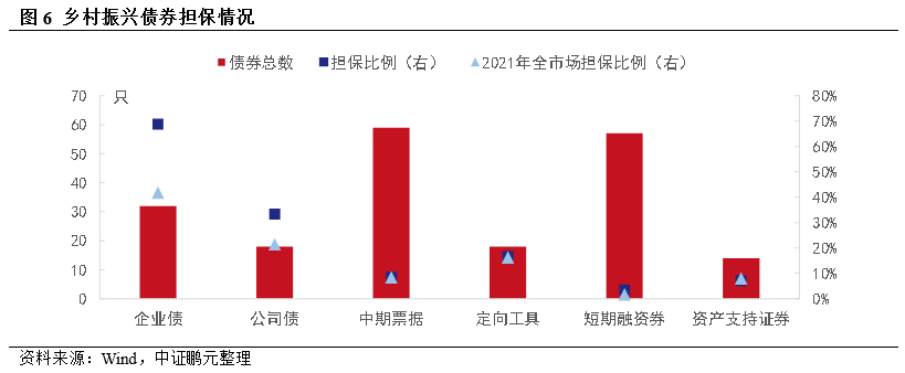 鄉(xiāng)村振興債券的擔(dān)保比例相對(duì)來(lái)說(shuō)高于全市場(chǎng)平均水平,其中,有擔(dān)保債券39只,占比19.7%。分債券類型看,企業(yè)債和公司債的擔(dān)保比例明顯高于市場(chǎng)平均水平。