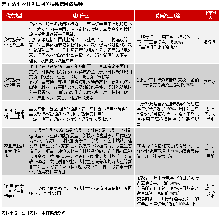 一號(hào)文件明確,擴(kuò)大鄉(xiāng)村振興投入,繼續(xù)把農(nóng)業(yè)農(nóng)村作為一般公共預(yù)算優(yōu)先保障領(lǐng)域。除財(cái)政和信貸資金支持外,結(jié)合現(xiàn)有鄉(xiāng)村振興政策,債券融資可以從以下領(lǐng)域入手:第一,募集資金用途可以用于高標(biāo)準(zhǔn)農(nóng)田建設(shè)、農(nóng)業(yè)相關(guān)科研,技術(shù)升級(jí),設(shè)施農(nóng)業(yè),農(nóng)產(chǎn)品倉(cāng)儲(chǔ)、物流、銷售,生態(tài)治理以及農(nóng)業(yè)相關(guān)保險(xiǎn)機(jī)構(gòu)補(bǔ)充資本。第二,從債券類型看,可以采用綠色債、新型城鎮(zhèn)化企業(yè)債、項(xiàng)目收益?zhèn)⑧l(xiāng)村振興票據(jù)等。