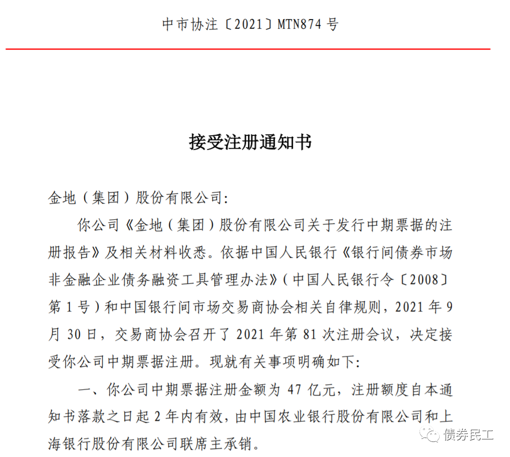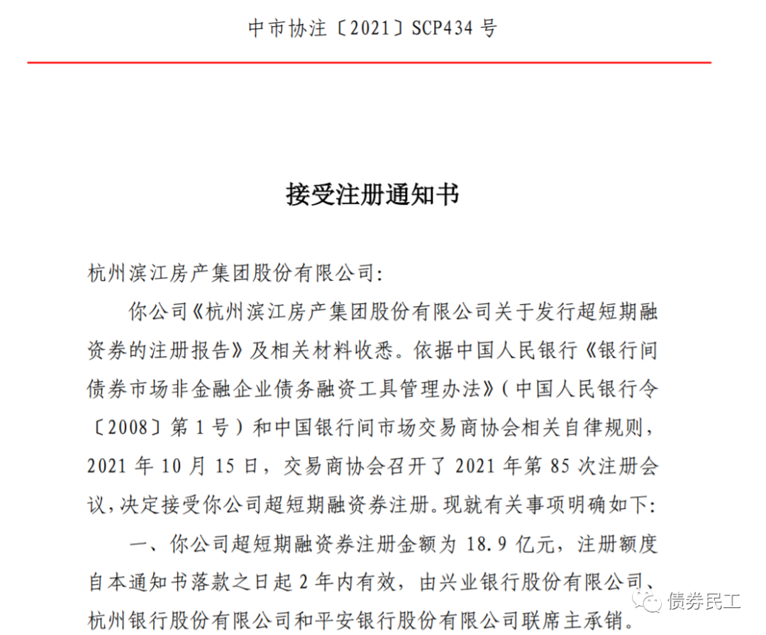 根據(jù)中國(guó)銀行間市場(chǎng)交易商協(xié)會(huì)網(wǎng)站的公開(kāi)信息,交易商協(xié)會(huì)于2021年11月24日接受金地(集團(tuán))股份有限公司、中交房地產(chǎn)集團(tuán)有限公司和杭州濱江房產(chǎn)集團(tuán)股份有限公司三家房地產(chǎn)公司總金額合計(jì)為135.60億元債務(wù)融資工具產(chǎn)品的注冊(cè),具體債務(wù)融資工具產(chǎn)品注冊(cè)情況如下: