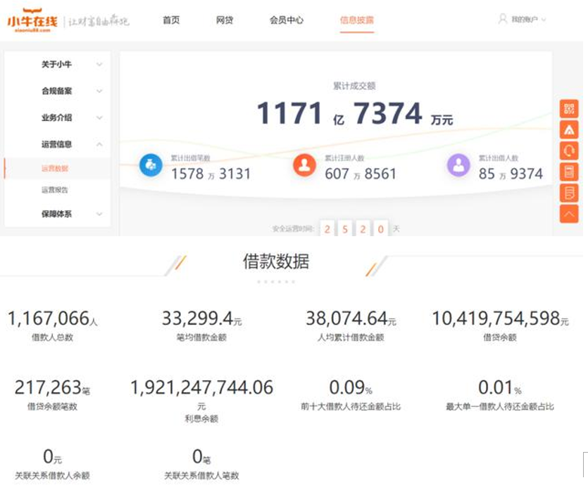 彼時小牛在線官網實時數據顯示,平臺累計成交額已達1171.74億元,累計出借筆數1578.3萬筆,注冊人數超608萬,出借人數85.94萬;借貸余額104.2億元,僅利息余額就多達19.2億元。