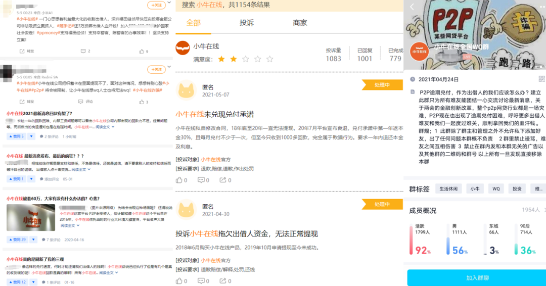 雷達財經注意到,在警方調查期間乃至于調查結果公布后,微博、知乎、黑貓投訴等平臺中仍有大量投資者控訴小牛在線平臺未按時兌付的事實。