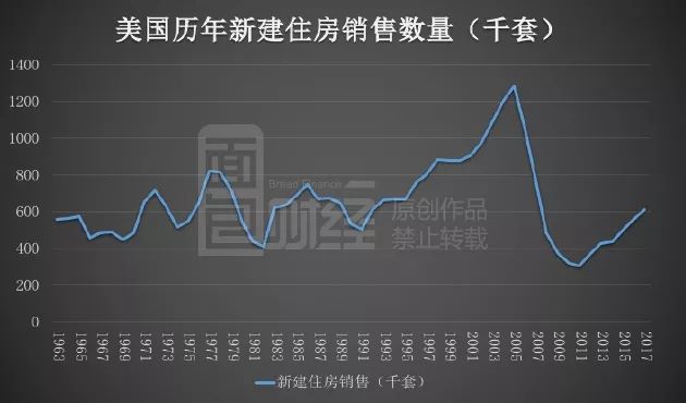 可以說,二戰后直至1970年代初,美國房地產行業的繁榮本質上是由城市化進程推動的。來看一下美國歷年新建住房銷售數量的情況: