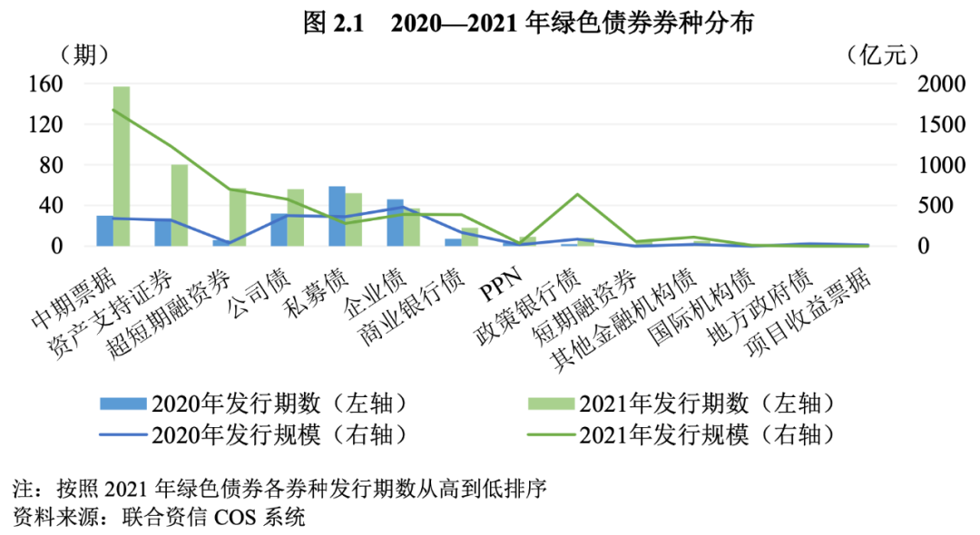 1.綠色中期票據發行量居首位,銀行間市場仍是綠色債券主要發行場所