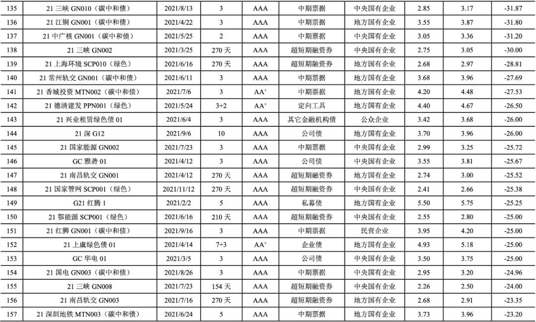 2021年,我國共有247期綠色債券的發行利率低于可比債券[14]的平均發行利率(詳見附表2),占比達到72.01%。2021年具有成本優勢的綠色債券的加權平均息差[15]為-24.64BP。具有成本優勢的綠色債券以國有企業(241期)為主,民營企業4期,公眾企業2期。