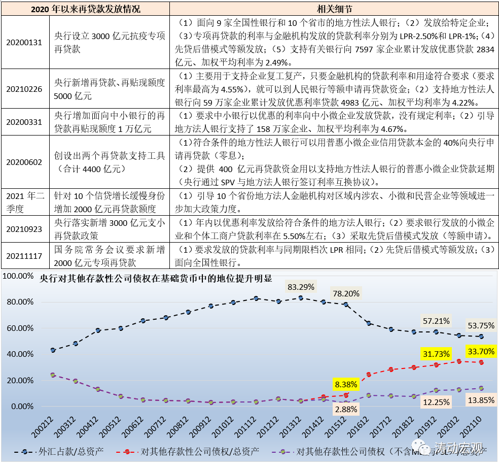 3、不過后來隨著出口貿(mào)易規(guī)模的擴(kuò)大以及央行公開市場(chǎng)操作工具的豐富,外匯占款和公開市場(chǎng)操作逐步成為央行投放基礎(chǔ)貨幣的主要方式,再貸款(再貼現(xiàn))工具的重要性有所下降。外匯占款在央行總資產(chǎn)中的比例已由2013年的83.29%降至2021年10月底的53.75%,而對(duì)其他存款性公司債權(quán)占總資產(chǎn)的比例亦由2009年的3.15%升至2021年10月底的33.70%