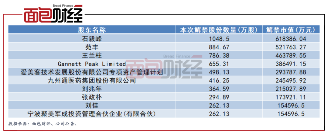 Gannett Peak Limited目前是愛美客第三大股東,值得注意的是,其要減持的這部分股權節前才獲得解禁。9月29日,愛美客共解禁5472.98萬股,市值總計達322.79億元,其中Gannett Peak共解禁655.31萬股。
