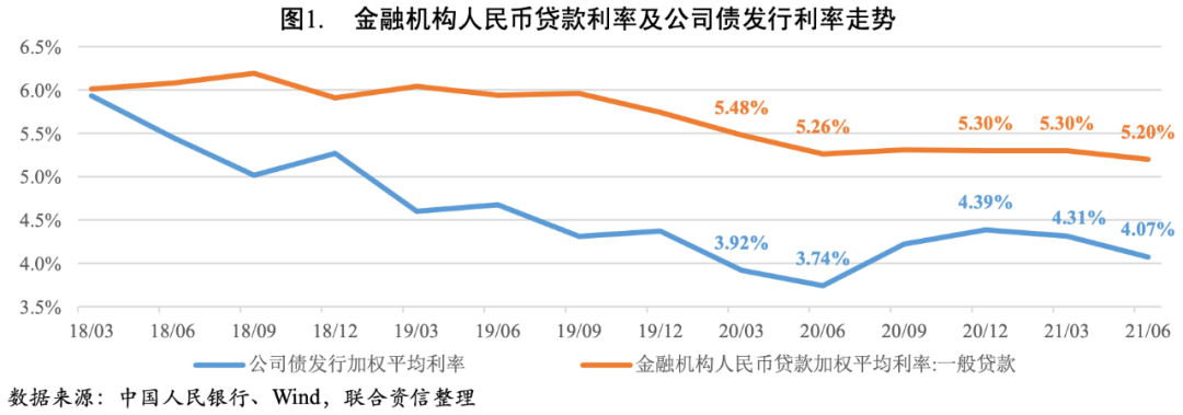 2021年上半年,貨幣政策基本回歸常態(tài),信貸力度總體穩(wěn)固,貸款利率穩(wěn)中有降,公司債發(fā)行利率呈下行趨勢(shì),但仍明顯高于上年同期。二季度公司債發(fā)行加權(quán)平均利率明顯下降,可能是由于一季度信用風(fēng)險(xiǎn)事件增多,導(dǎo)致市場(chǎng)風(fēng)險(xiǎn)偏好降低,高級(jí)別發(fā)行人占比提高,從而拉低了平均利率。