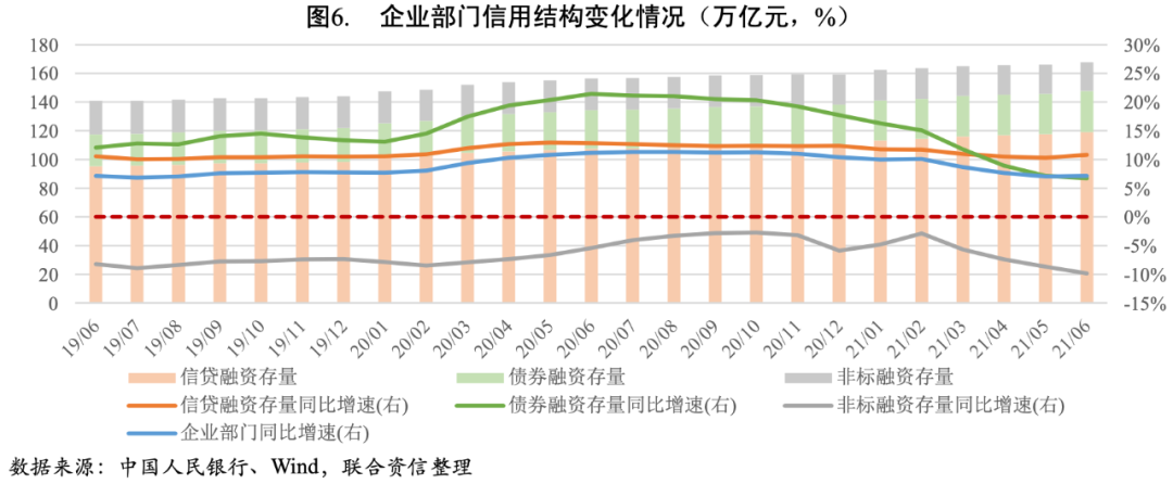 企業(yè)部門信用結(jié)構(gòu)進(jìn)一步分化。在上年同期高基數(shù)影響下,截至2021年6月末,企業(yè)部門信貸融資、債券融資以及非標(biāo)融資存量同比增速均有所下降。信貸融資基本保持平穩(wěn)增長(zhǎng),同比增速小幅下降1.58個(gè)百分點(diǎn)至10.78%。2021年上半年非金融企業(yè)部門新增人民幣貸款8.37萬(wàn)億元,為僅次于上年同期的歷史較高值。從結(jié)構(gòu)來(lái)看,中長(zhǎng)期貸款仍是主導(dǎo)地位,新增6.62萬(wàn)億元,創(chuàng)歷史新高,反映出企業(yè)資本開支需求旺盛;新增短期貸款與票據(jù)融資同比少增,反映出企業(yè)流動(dòng)性管理訴求趨于正常。債券融資下降明顯,同比增速大幅下降10.98個(gè)百分點(diǎn)至6.72%。上半年新增債券融資規(guī)模不及上年同期的一半,除上年高基數(shù)影響之外,上半年企業(yè)債券發(fā)行利率較上年同期顯著升高、4月底出臺(tái)政策加強(qiáng)公司債信息披露要求和限制發(fā)行規(guī)模以及募集用途等因素可能也對(duì)企業(yè)發(fā)債產(chǎn)生一定抑制作用。非標(biāo)融資持續(xù)壓降,同比增速進(jìn)一步下降3.96個(gè)百分點(diǎn)至-9.84%。上半年非標(biāo)融資規(guī)模收縮8437億元,同比多減8698億元。