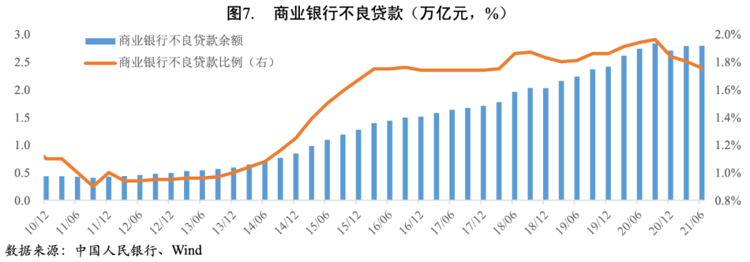截至2021年6月末,我國(guó)商業(yè)銀行不良貸款余額2.79萬(wàn)億元,較上年末增加892.78億元;商業(yè)銀行不良貸款率1.76%,較上年末下降0.08個(gè)百分點(diǎn),主要是國(guó)內(nèi)經(jīng)濟(jì)延續(xù)良好復(fù)蘇態(tài)勢(shì),疊加監(jiān)管部門引導(dǎo)金融機(jī)構(gòu)強(qiáng)化風(fēng)險(xiǎn)防范、加大不良處置力度,使得商業(yè)銀行信貸資產(chǎn)質(zhì)量保持穩(wěn)定。此外,去年為對(duì)沖疫情影響出臺(tái)的普惠小微企業(yè)貸款延期還本付息政策和信用貸款支持政策,進(jìn)一步延長(zhǎng)至2021年底,有利于穩(wěn)定企業(yè)現(xiàn)金流,緩釋流動(dòng)性風(fēng)險(xiǎn),對(duì)商業(yè)銀行不良貸款率的穩(wěn)定具有積極效果。