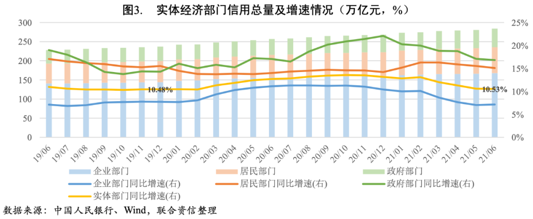 2021年上半年我國(guó)實(shí)體經(jīng)濟(jì)部門信用擴(kuò)張整體呈現(xiàn)放緩的趨勢(shì)。截至2021年6月末,我國(guó)實(shí)體經(jīng)濟(jì)部門信用總量達(dá)到284.03萬(wàn)億元[2],較上年末凈增15.72萬(wàn)億元;同比增長(zhǎng)10.53%,增幅較上年末回落2.63個(gè)百分點(diǎn),基本下降至疫情前的水平。