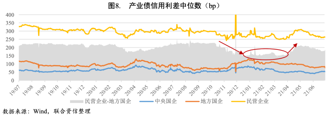 2021年上半年,債券市場(chǎng)新增違約主體18家,到期違約金額合計(jì)約778.97億元,較上年同期有所上升,債券市場(chǎng)信用風(fēng)險(xiǎn)繼續(xù)釋放。從信用利差來(lái)看,在上年四季度連續(xù)發(fā)生大型國(guó)企的違約事件后,地方國(guó)企的產(chǎn)業(yè)債信用利差迅速走高,與民營(yíng)企業(yè)產(chǎn)業(yè)債信用利差之差(圖8中灰色部分)縮窄近80bp,今年一季度仍保持在較低的150bp左右,與一季度國(guó)企違約事件頻發(fā)[4]相印證,高杠桿、弱資質(zhì)國(guó)企信用風(fēng)險(xiǎn)繼續(xù)暴露;二季度國(guó)、民企利差出現(xiàn)分化,民營(yíng)企業(yè)信用利差上行,地方國(guó)企信用利差呈下行趨勢(shì),反映出二季度民企違約數(shù)量有所增加,信用風(fēng)險(xiǎn)上升,市場(chǎng)對(duì)地方國(guó)企的擔(dān)憂情緒有所緩和。