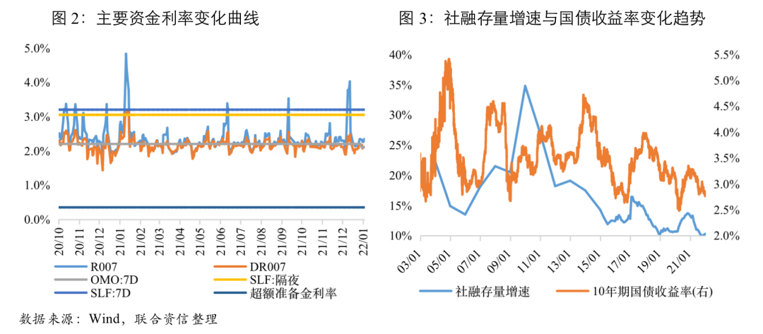 2021年12月以來,各類會議頻頻釋放穩增長信號,市場對寬信用和寬貨幣預期愈加濃厚。央行在2022年工作會議上明確,要切實擔負起穩定宏觀經濟的責任,主動推出有利于經濟穩定的貨幣金融政策,增強信貸總量增長的穩定性,加大對實體經濟的支持力度。2022年1月17日,MLF和7天逆回購利率同時下調10BP,雖然降息在市場預期內,但降息幅度超過市場預期,消息公布后10年期國債收益率迅速下行后小幅回升?;仡櫄v史上的多次降息后國債利率在短期內快速下行后大概率會出現回調,且預計一季度不會迎來第二次降息;降準方面,2022年1月18日劉國強副行長表示“當前金融機構平均存款準備金率是8.4%,這個水平已經不高了”,但同時指出“空間變小了,但仍然還有一定的空間,可以根據經濟金融運行情況以及宏觀調控的需要使用”,預計一季度降準的可能性較小。綜合看,一季度貨幣政策進一步寬松的空間有限,疊加上文分析的一季度經濟回暖的可能性較大,且社融在政策的推動下或將迎來反彈,一季度對10年期國債收益率形成向上的壓力。全年來看,2022年貨幣政策較2021年邊際寬松,是國債收益率下行因素之一。