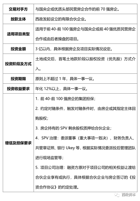(2)投資前提條件:融資方最好為前40-前100強房企,適用于該前100強房企與國央企或經(jīng)認可的前40強優(yōu)質民營房企合作開發(fā)類項目;合伙企業(yè)在項目交完土地保證金后介入,其中前融資金可根據(jù)項目實際情況與開發(fā)貸并存;融資方原對于項目公司的相關權益讓渡給合伙企業(yè)享有或執(zhí)行,具體根據(jù)合伙企業(yè)與房企簽訂的《投資合作協(xié)議》的約定處理。