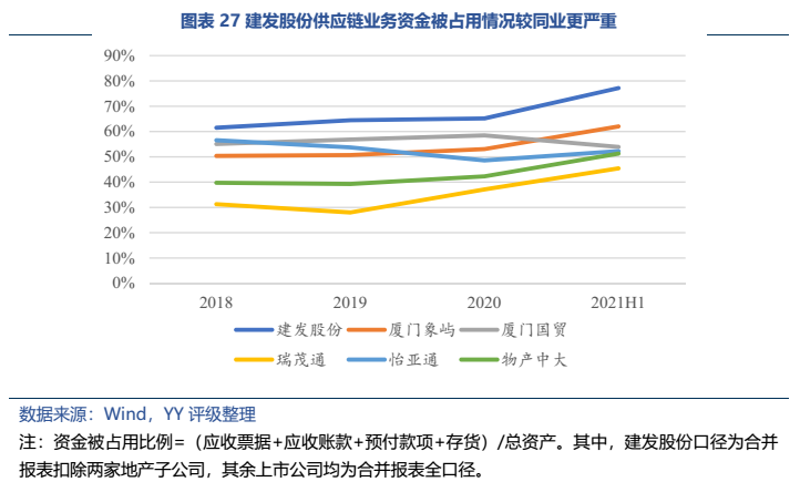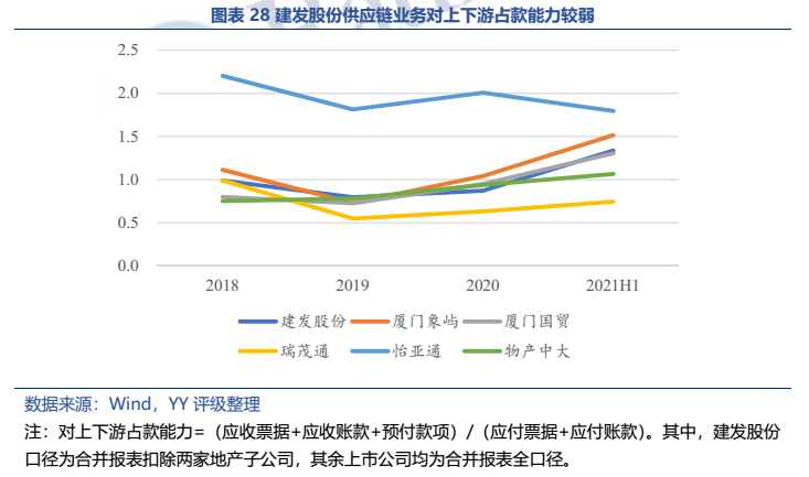 作為一家“供應鏈+地產”雙主業經營的企業,建發股份左手有供應鏈業務提供的穩定現金流,右手有地產開發帶來的高額利潤,兩大業務在盈利與現金流方面實現了一定程度的協同互補。從經營層面來看,供應鏈業務在國內持續領先(2020年排名第三),規模優勢顯著,盈利能力位于行業中上游,周轉能力較低,基本面保持穩定;地產業務近3年才實現突飛猛進的增長。從資金流向來看,建發股份的地產業務負債端資金偏長期,供應鏈業務負債端偏短期,與各自的業務特征匹配度較高。