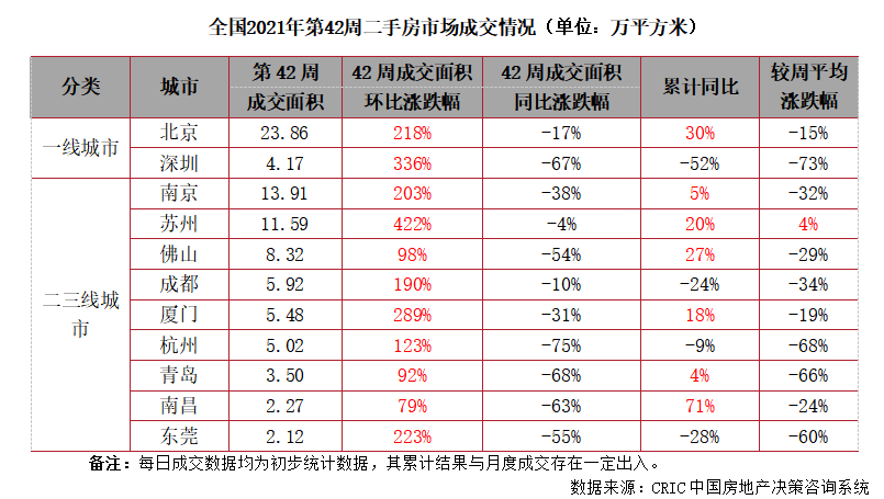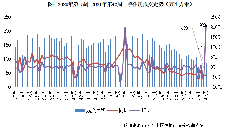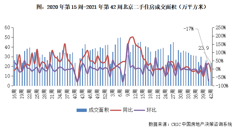 2021年第42周,北京二手住房成交面積收至23.9萬平方米,環比增長218%,同比下跌17%。下半年以來北京市場穩步回落,本周市場熱度回歸但體量較前期仍有下滑趨勢,后續市場或保持穩中有降。