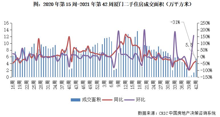 2021年第42周,廈門二手住房成交面積環比大幅增長289%,同比去年跌幅收窄至31%,成交規模收5.5萬平方米。4月廈門整治二手房交易以來效果顯著,市場成交表現持續走弱,本周成交持續回升且節后需求放量增長至近6周高點,后續市場或持續穩中有升。