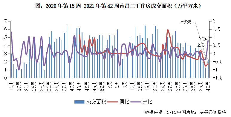 2021年第42周,南昌二手住房成交規模收2.3萬平方米,環比增長79%,同比跌幅收窄至63%。本周市場成交體量如期回升且同比跌幅有所收窄,預計后續市場或持續回升態勢。