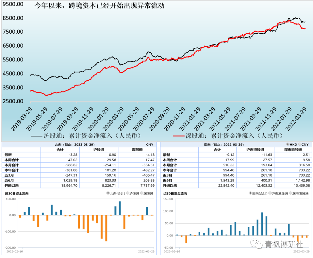 (四)今年以來受美聯儲等經濟體政策收緊以及地緣博弈加劇等因素影響,跨境資本已經開始出現異常流動,引起了市場及決策層的警覺,在連續兩個月的持續寬松后,制約著貨幣政策的進一步寬松。具體看,今年以來和今年3月以來,北向通資金凈流出規模分別達到381.08億元和588.62億元,南向通資金凈流入 規模則分別達994.40億元和510.22億元。