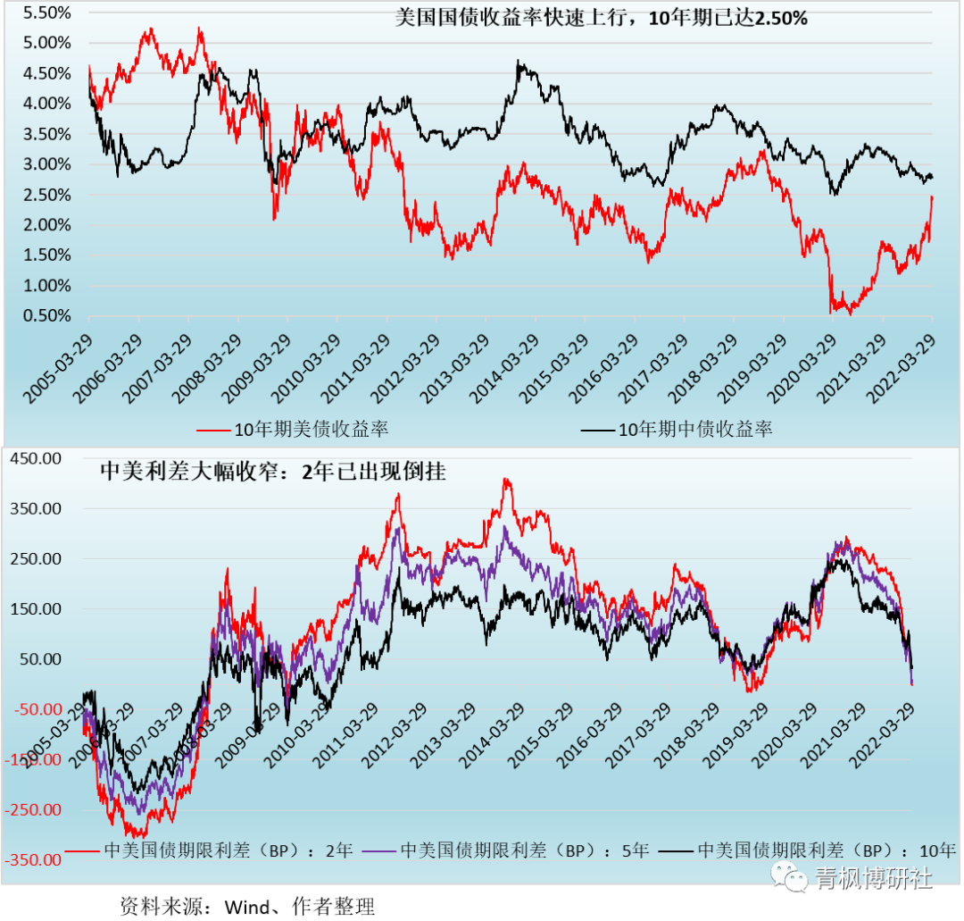 隨著市場對美聯儲全年加息6次以上、加息幅度達150BP以上的預期升溫,美債收益率近期上升快,10年期美債收益率已達2.50%附近,推動中美期限利差大幅收窄。具體看,截至2022年3月29日,10年期、5年期和2年期中美國債期限利差已分別收窄至37.53BP、9.64BP和-0.66BP,遠遠小于87.51BP、118.81BP和141.85BP的歷史中位數以及64.05BP、94.07BP和118.12BP的歷史均值(2003年4月以來)。特別是,中美2年期國債期限利差已經出現倒掛,5年期國債期限利差離倒掛也已不遠,10年期國債期限利差離倒掛亦僅差30BP左右。