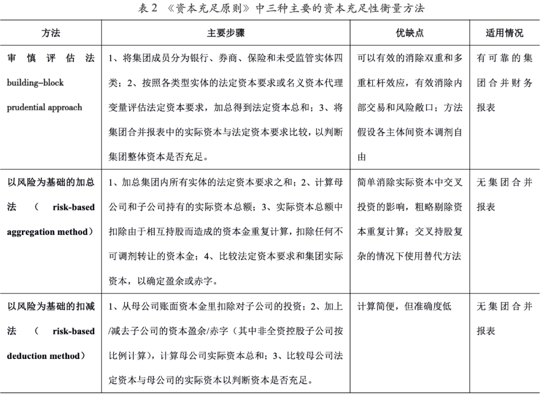 從聯(lián)合論壇推薦的三種主要方法來看,基于合并報表計算的審慎評估法準確性最高,可以有效的消除雙重和多重杠桿效應,有效消除內(nèi)部交易對整體資本充足率測算的影響,但其結果高度依賴于合并報表的準確性,并且對于各主體間資本自由調劑的假設不符合目前實際情況,可能忽視相關主體具體風險;以風險為基礎的加總法思路主要是從集團所有實體的實際資本中扣除相互持股導致的資本重復計算問題,相對簡單,但精確度不高,聯(lián)合論壇建議在內(nèi)部交叉持股結構復雜的情況下,可以采用加總母公司和“識別集團外部資本”的替代方法,其中推薦認可的集團外部資本主要包括:非控股股東的權益投資、第三方交易產(chǎn)生的留存收益、符合要求的資本補充債務工具;以風險為基礎的扣除法主要基于母公司報表,并假設母公司按照持股比例調劑/承擔子公司的資本盈余/不足,且未區(qū)別考慮主要股東對資本的補足義務,未考慮子公司資本盈余的自由調劑情況,整體準確性不高。