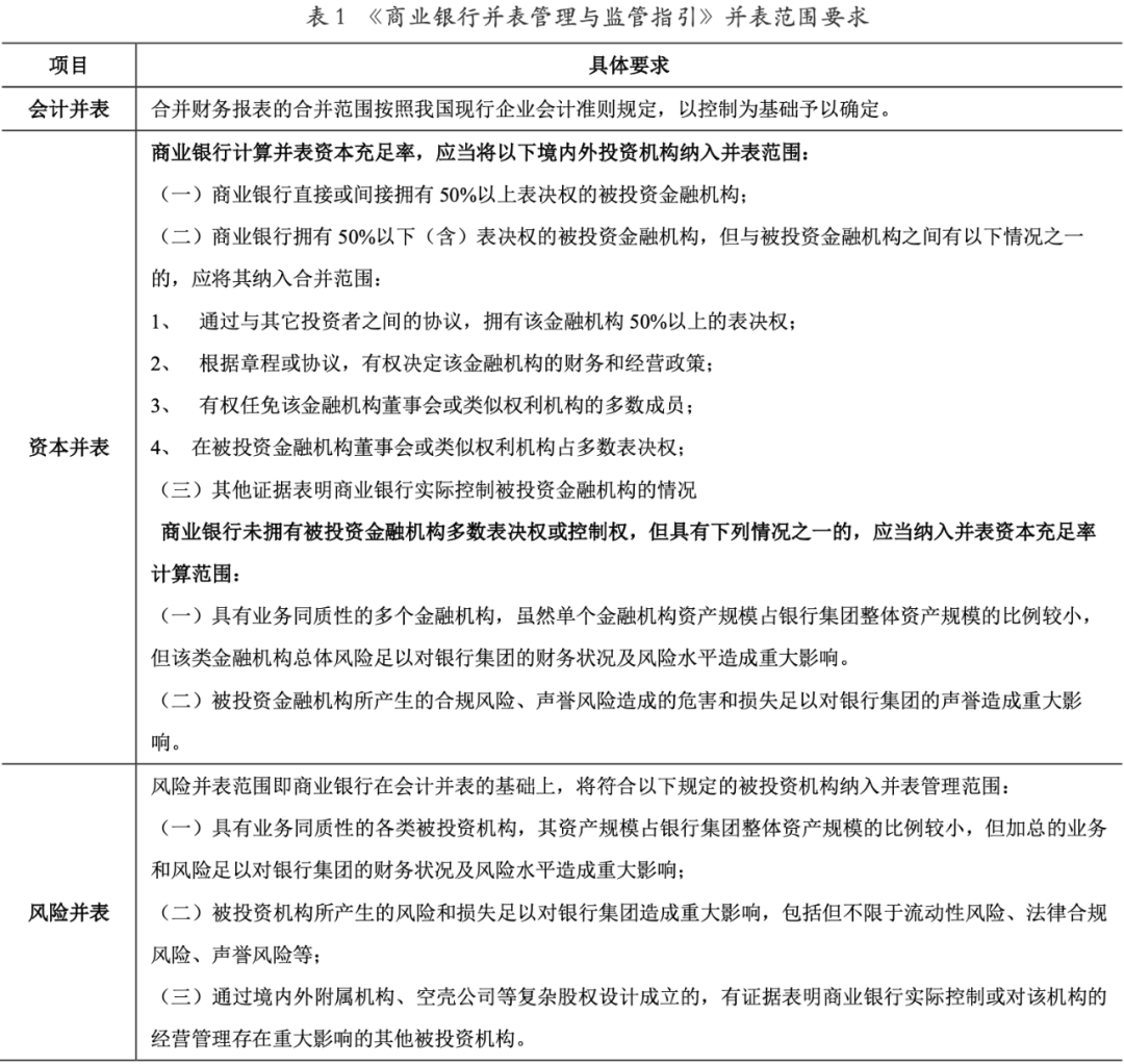 從并表的范圍來看,由于監(jiān)管目標和會計目標的差異,監(jiān)管機構會在會計并表的基礎上,充分考慮重大風險因素,按照風險并表的思路拓展資本并表和風險并表的范圍,如聯(lián)合論壇認為需“識別和計量所有具有潛在資本需求的重大風險,無論是表內(nèi)還是表外業(yè)務風險”,如歐盟就金融控股公司視具體情況確定了三種并表范圍。我國原銀監(jiān)會在《商業(yè)銀行并表管理與監(jiān)管指引》中也明確提出了會計并表、資本并表和風險并表的三種并表范圍,具體如下表所示。