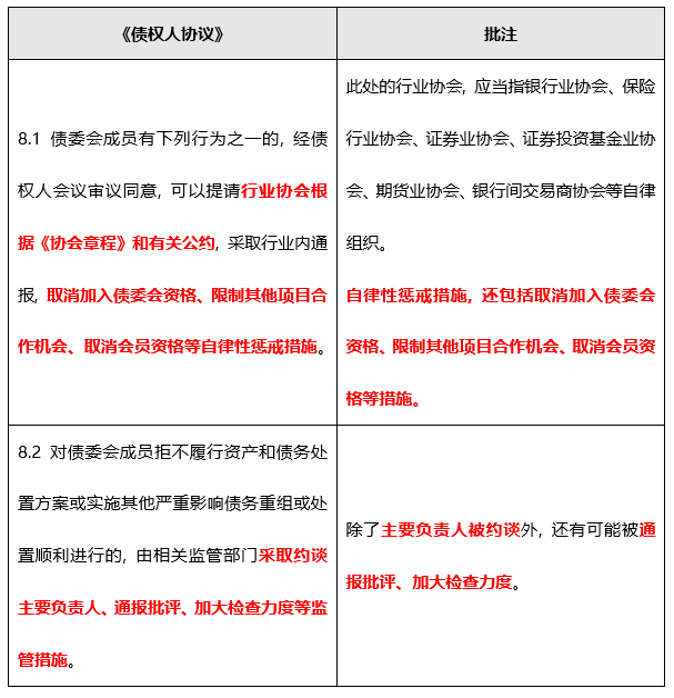 當然如果我們進一步去看債權人協議, 就會發現在不同債權人協議中往往還會對自律懲戒措施和行政監管機構有可能采取的措施有進一步的列舉, 以某個金融機構債權人委員會的債權人協議第8條違約條款的規定為例:
