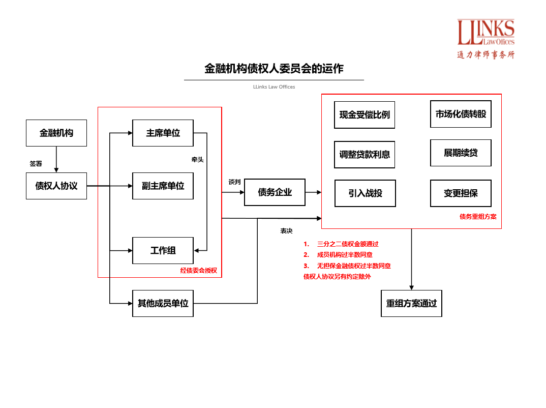 那么, 債委會主席單位、副主席單位和工作組又要怎么推動債務重組工作呢? 根據《金融機構債權人委員會工作規程》第十一條的規定, 經債委會依法授權, 主席單位、副主席單位、工作組可以與債務企業開展協商談判, 研究包括現金受償比例、調整貸款利息、展期續貸、變更擔保、市場化債轉股、引入合格戰略投資者等在內的金融債務重組方案, 也就是說成立債委會后, 真正與債務企業直接進行談判, 設計債務重組方案的其實就是主席單位、副主席單位和工作組, 所以這三者在金融機構債權人委員會中是占絕對的核心位置。