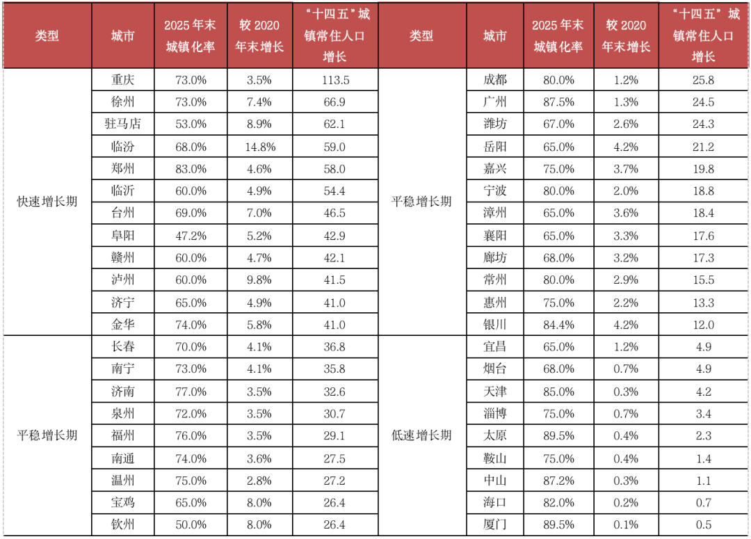 依據“十四五”期間各城市城鎮化規劃進程,基本可以劃分為以下三類: