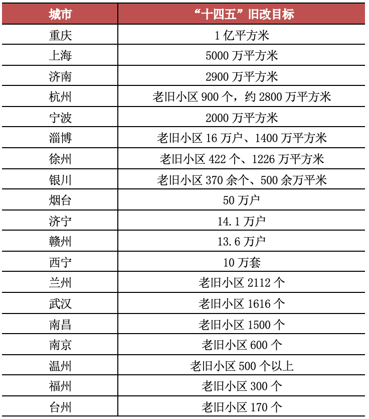 從公布“十四五”舊改目標的19個城市來看,杭州、濟南、寧波等一、二線城市舊改規模均達到2000萬平方米以上,徐州、淄博等三、四線城市同樣突破1000萬平方米。例如重慶,“十四五”期間將實施1億平方米老舊小區改造。