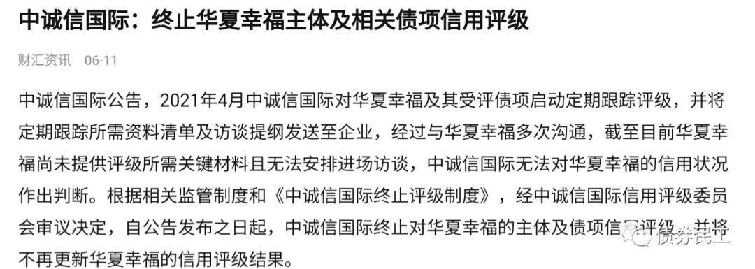 根據(jù)財(cái)匯資訊2021年6月11日的報(bào)道,因華夏幸福尚未提供評級所需要的關(guān)鍵材料且無法安排進(jìn)場訪談,中誠信決定終止對華夏幸福的主體及債項(xiàng)評級。