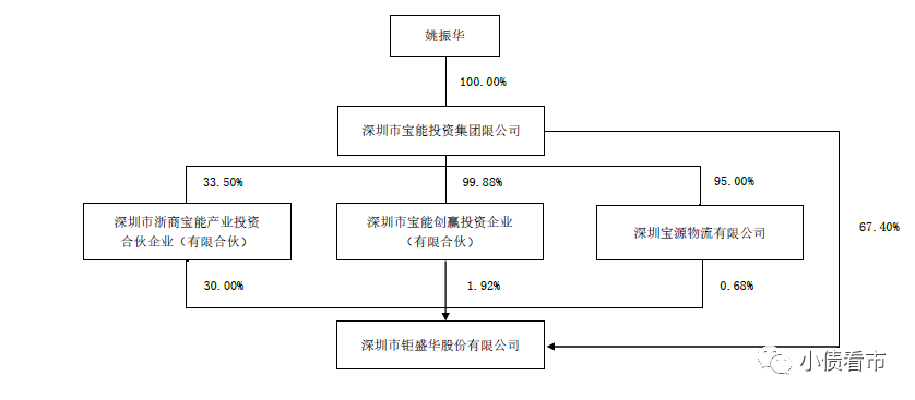從股權結構看,鉅盛華的控股股東為寶能投資集團,持股比例為67.4%,公司實際控制人為姚振華。