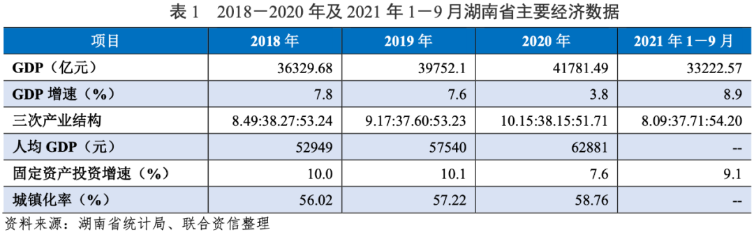 湖南省整體經(jīng)濟(jì)實(shí)力較強(qiáng),經(jīng)濟(jì)總量位于全國中等偏上水平,人均GDP處于全國中等水平,經(jīng)濟(jì)發(fā)展態(tài)勢良好。2021年前三季度,隨著“新冠”疫情影響的逐步減弱以及固定資產(chǎn)投資的回暖,湖南省經(jīng)濟(jì)水平大幅回升。2020年,湖南省一般公共預(yù)算收入規(guī)模處于全國各省市自治區(qū)中上游水平,財政自給能力偏弱,整體財政實(shí)力一般;湖南省負(fù)債率及債務(wù)率在全國各省(自治區(qū)、直轄市)中均處于相對較高水平,債務(wù)負(fù)擔(dān)相對較重。