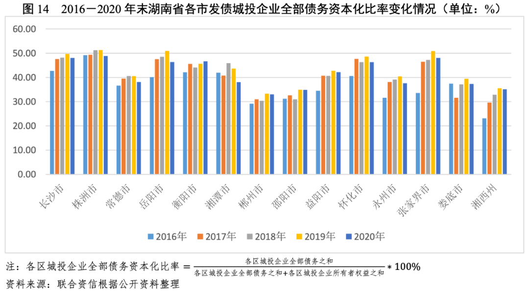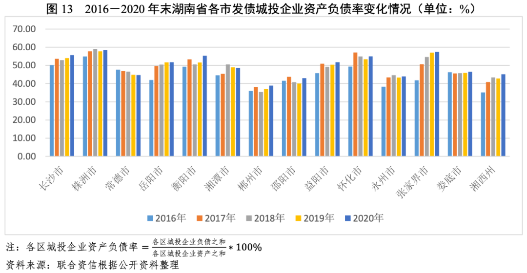 從發(fā)債城投企業(yè)全部債務(wù)與“發(fā)債城投企業(yè)全部債務(wù)+地方政府債務(wù)”的比值看,截至2020年底,長沙市、常德市、株洲市、岳陽市和湘潭市發(fā)債城投企業(yè)全部債務(wù)占地區(qū)不完全統(tǒng)計債務(wù)(發(fā)債城投企業(yè)全部債務(wù)+地方政府債務(wù))的比重超過60%,其他地級市比重大部分集中在50%以下,整體處于偏高水平。