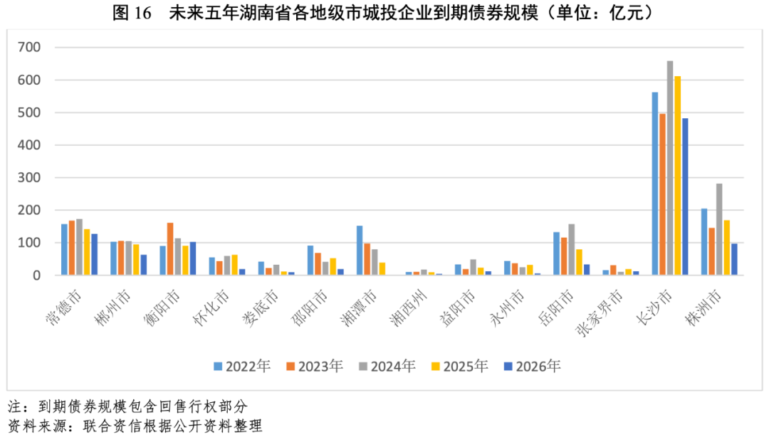 從湖南省各地級市發(fā)債城投企業(yè)未來五年(2022-2026年)到期債券規(guī)模看,長沙市、株洲市和常德市的城投企業(yè)未來三年集中到期債券規(guī)模大,湘西州、益陽市、張家界市和婁底市城投企業(yè)到期債券規(guī)模相對較小,各地級市未來五年債券到期規(guī)模整體處于波動下降趨勢,債務(wù)償還日期主要集中在2022-2024年。