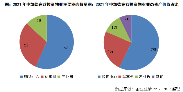與華潤開發投資物業的方向類似,凱德長期以來也是以購物中心為核心,同時也涉足開發寫字樓以及公寓等其他業態。截至2021年中,凱德在中國在營的投資物業中共有43家購物中心、23個寫字樓以及10個產業園項目,資產總價值約為205.8億新加坡元(按2021年6月30日匯率計算約987.8億元人民幣),占集團總資產的25.2%。其中購物中心對投資物業資產總值占比約為57.1%,寫字樓占比為24.3%。