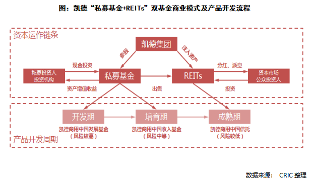 根據商業項目從籌備建設、開業初期、穩定運營各環節的發展需要,凱德一般會對應不同類型的金融產品。一般來看,開發期和培育期的商業物業,由于高風險、高收益的項目特點,凱德主要用房地產私募基金進行投資;對于現金流穩定的成熟商業物業,風險相對較小,凱德主要用REITs進行投資而后實現退出,形成完整的投資和退出閉環,且在此過程中,REITs通常對私募基金培育的項目具有優先購買權。至此,凱德已經形成了“私募基金培育,再打包出售給REITs”的雙基金配對運作模式。