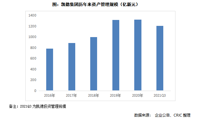 截止2021年9月30日,凱德投資旗下管理資產規模(AUM)約為1208億新元,房地產基金管理規模(FUM)約為843億新元,通過6支上市房地產投資信托和商業信托,以及30個私募基金持有。