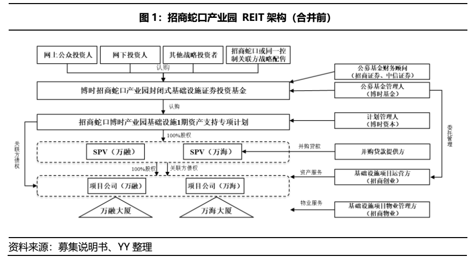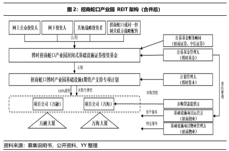 招商蛇口產業園REIT采用 “封閉式公募基金—資產支持專項計劃—項目公司—項目”的結構,在底層搭建上,先設立SPV公司對項目公司進行股權受讓和債權搭建,之后再用項目公司進行反向吸收合并。