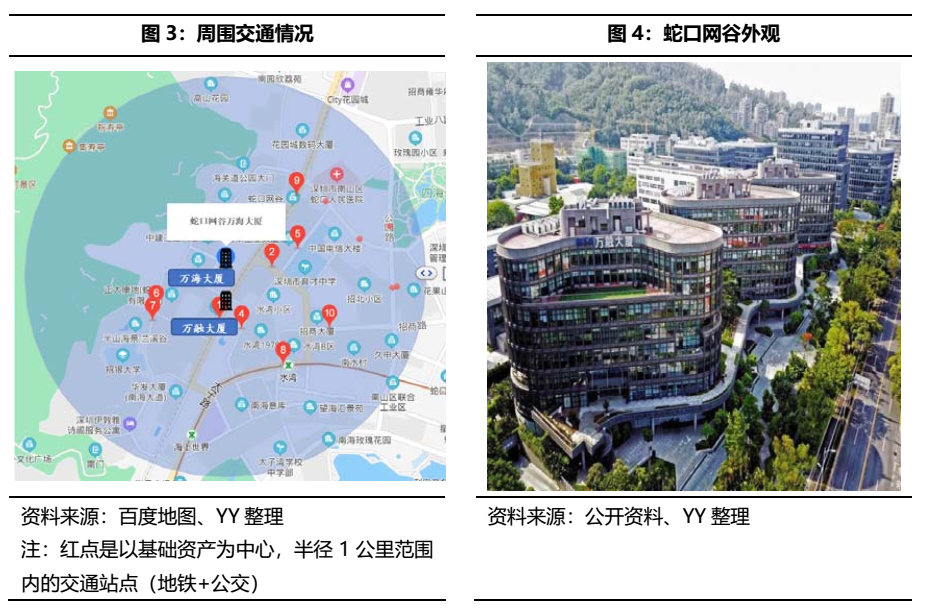 招商蛇口產業園REIT的底層資產為位于蛇口網谷產業園中的萬融大廈和萬海大廈兩處園區物業,蛇口網谷產業園位于蛇口工業區(蛇口工業區是前海蛇口自貿片區三個功能區的其中之一,重點發展網絡信息、科技服務、文化創意等服務)。直觀來看,蛇口網谷產業園周圍范圍內包含多個公共交通站點,交通便利,配套齊全,且作為低密度的寫字樓,依山傍海,辦公環境優越,較為適合追求品質型辦公租戶。