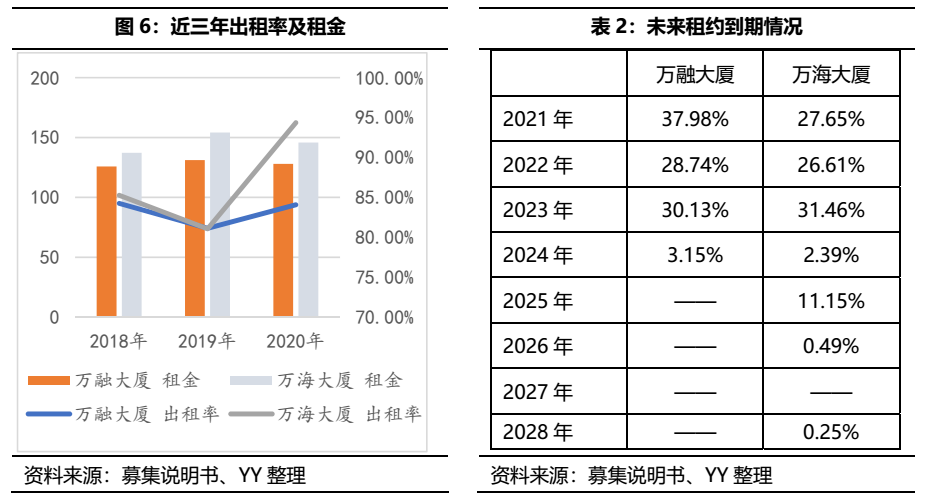出租率是產業園租金收入的重要衡量指標,出租率越高,租賃收入越高,同時空置機會成本越低,意味著項目當期分紅越高。萬融、萬海大廈的出租率在2019年均有小幅下降(2019年為集中到期年),但2020年疫情期間出臺租金優惠方案后,有一定反彈,不考慮疫情因素,大樓租金的年增長率約為5%。且租戶租期以1-3年為主,因此租約到期情況較為均勻,保證了現金流的穩定。