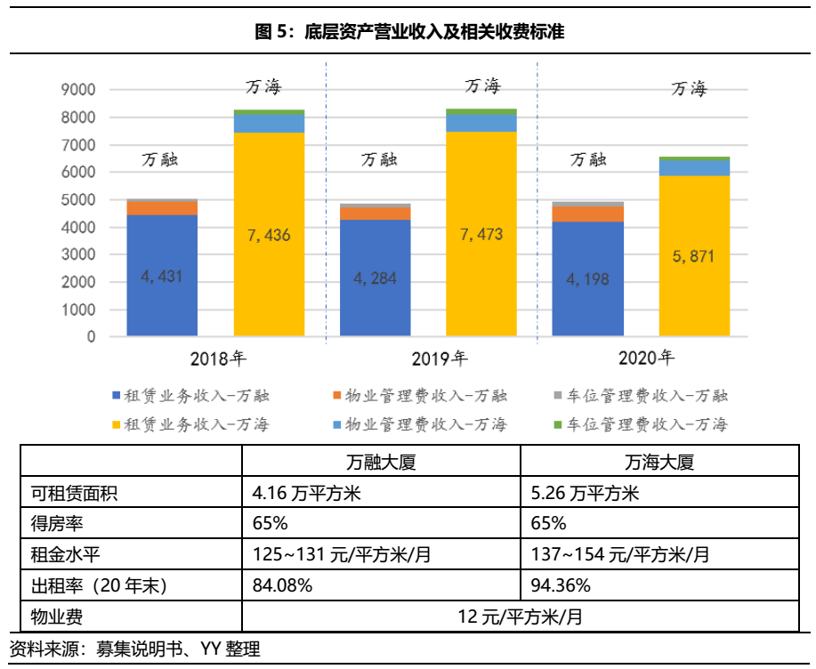 萬融大廈、萬海大廈均為工業用地,于2014年竣工,使用年限至2062年。可租賃面積分別為4.16萬平方米及5.26萬平方米,資產估值分別為10.35億元、14.93億元(依舊采用收益法對資產組估值)。其實兩棟大樓本質就是寫字樓,但因為工業用地的屬性,就可以披著產業園的外衣,裝進公募REITs的底層資產中。