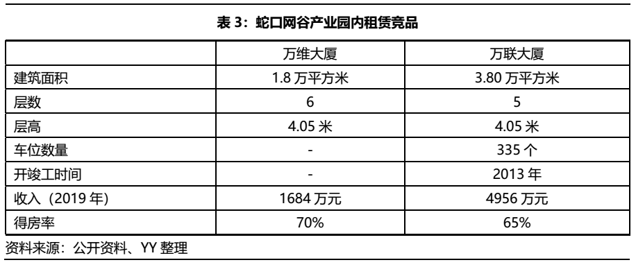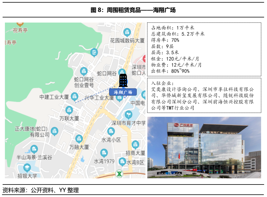 對比蛇口產園周圍的租賃競品:以距離蛇口網谷近800米的海翔廣場(開發商為世紀海翔),是于 2015年竣工的甲級寫字樓,得房率為70%,租賃面積以400平方米以下小戶型為主,租金為120元/平米/月,層高為3.5米,出租率保持在80%~90%,硬件方面和底層資產的兩座大廈差異不大,主要是在入住企業類型方面存在不同,以科技、TMT行業公司為主。