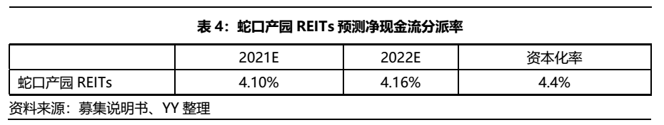 本次蛇口產園REIT2021年預測凈現金流分配率為4.1%,首年資本化率為4.4%(資產運營收入與價值之間的比例)。產業園REITs底層資產屬于不動產,其收益除租金收入等固定收益類的現金分派外,可能獲得底層資產價值上升帶來的增值收益。因此產權類REITs的股性特征更明顯,相較經營權類REITs性質更接近股權。