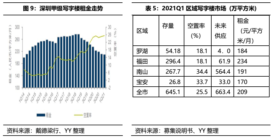 首先租金方面,自19年來深圳的甲級寫字樓租金增勢不在,且2020年因疫情影響,租金減少更為明顯,因此在諸多評估報告中推測的未來可以保持5%的租金增長率,就事實來看,保持存疑態度。