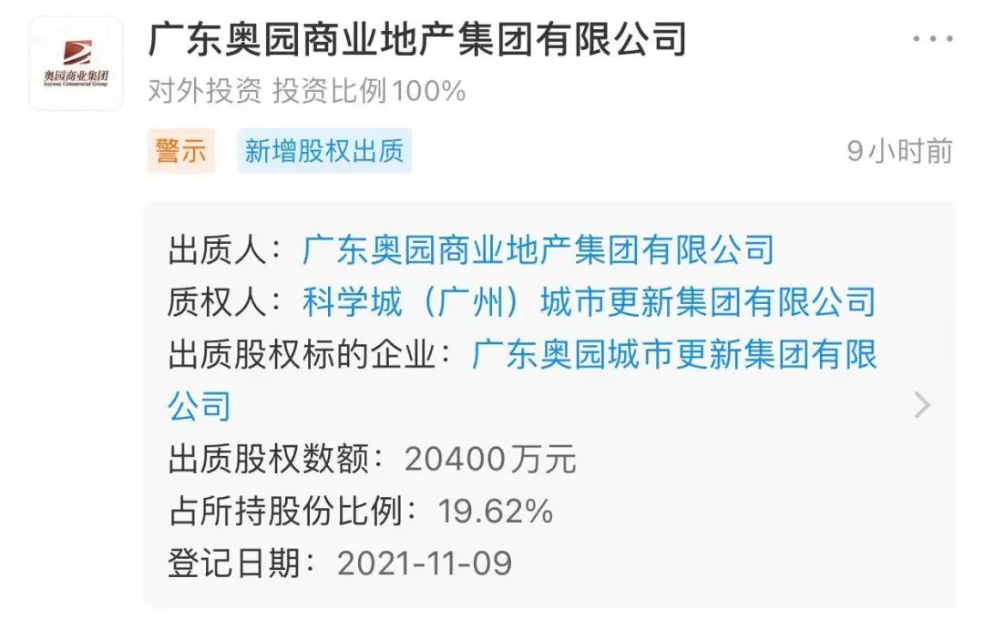工商資料顯示,11月9日,奧園孫公司廣東奧園商業地產集團有限公司,將所持廣東奧園城市更新集團有限公司10%的股權質押給科學城(廣州)城市更新集團有限公司。