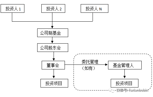 公司型基金是投資者通過出資形成一個公司法人實體,可以自行或委托專業基金管理人進行基金管理,其基本架構如下:
