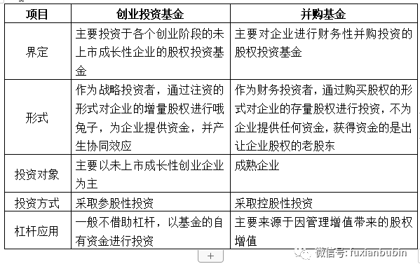根據企業的發展階段(創建、發展、重組等)的不同,股權投資基金包括創業投資基金和并購基金。二者之間差異主要集中在如下幾個方面: